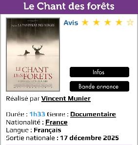 HAprès La Panthère des neiges, Vincent Munier nous invite au coeur des forêts des Vosges. C’est ici qu’il a tout appris grâce à son père Michel, naturaliste, ayant passé sa vie à l’affut dans les bois. Il est l’heure pour eux de transmettre ce savoir à Simon, le fils de Vincent. Trois regards, trois générations, une même fascination pour la vie sauvage. Nous découvrirons avec eux cerfs, oiseaux rares, renards et lynx… et parfois, le battement d’ailes d’un animal légendaire : le Grand Tétras.oraires